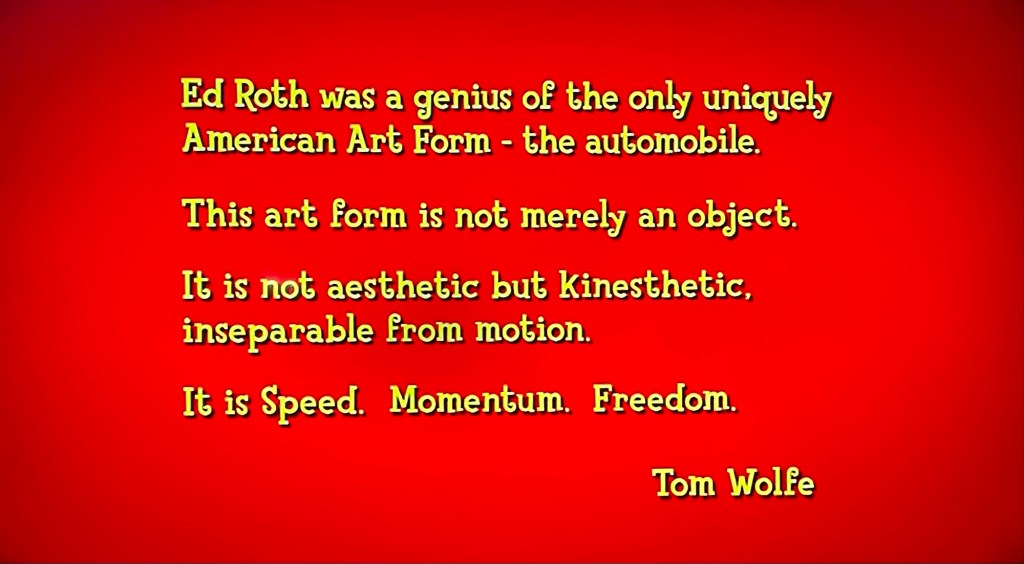 This is a documentary about his life and his art, hosted by his best known creation, Rat Fink, and it is a documentary with a big difference: all the cars are given voices and personalities and tell the story of Roth’s life in that manner. There is also some fun animations of both him and his characters as interstitials between scenes.