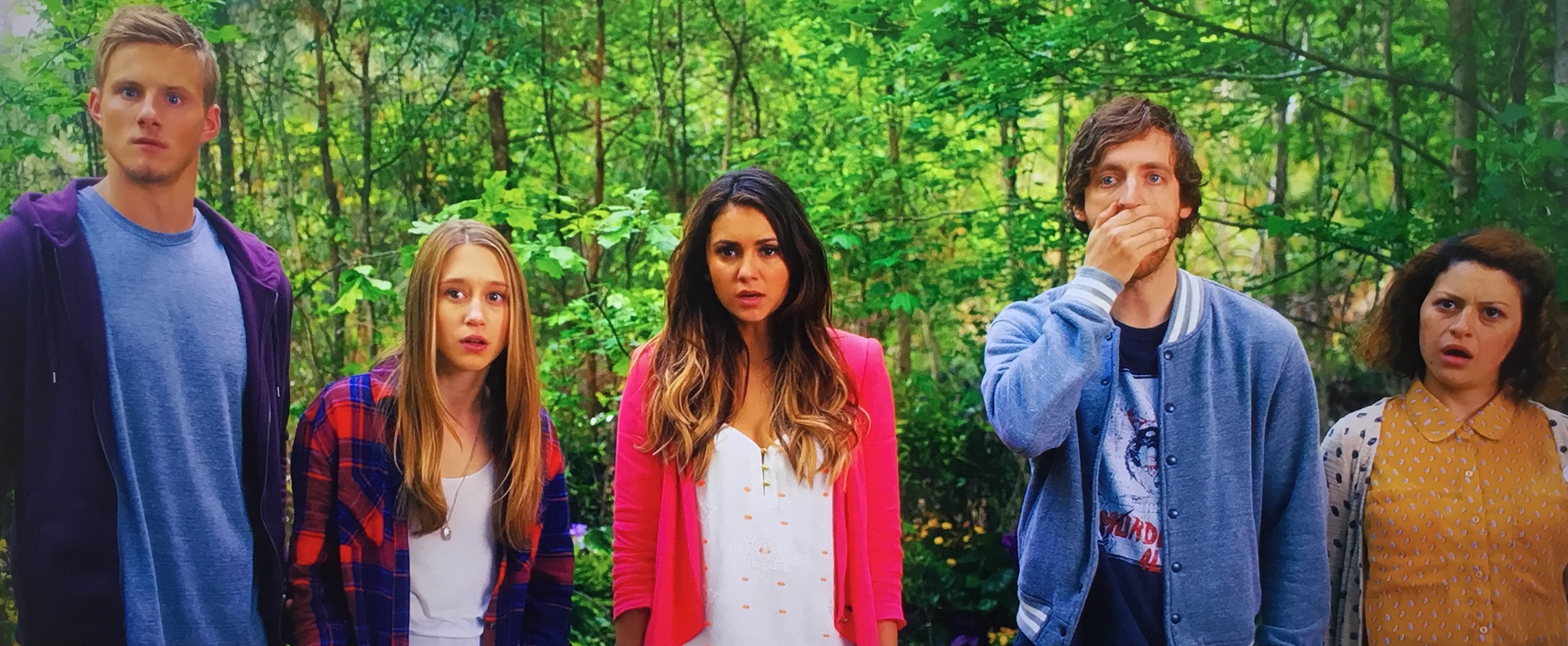 Max is joined by her best friend, Gertie (Alia Shawkat), Gertie’s step-brother (who also organised the film festival) Duncan (Middleditch), her potential love-interest Chris (Alexander Ludwig) and Chris ex (and Max’s ex-best friend), Vicki (Nina Dobrev) to see the film, but the cinema is accidentally set alight, and to escape, the group have to cut their way through the actual movie screen to escape…