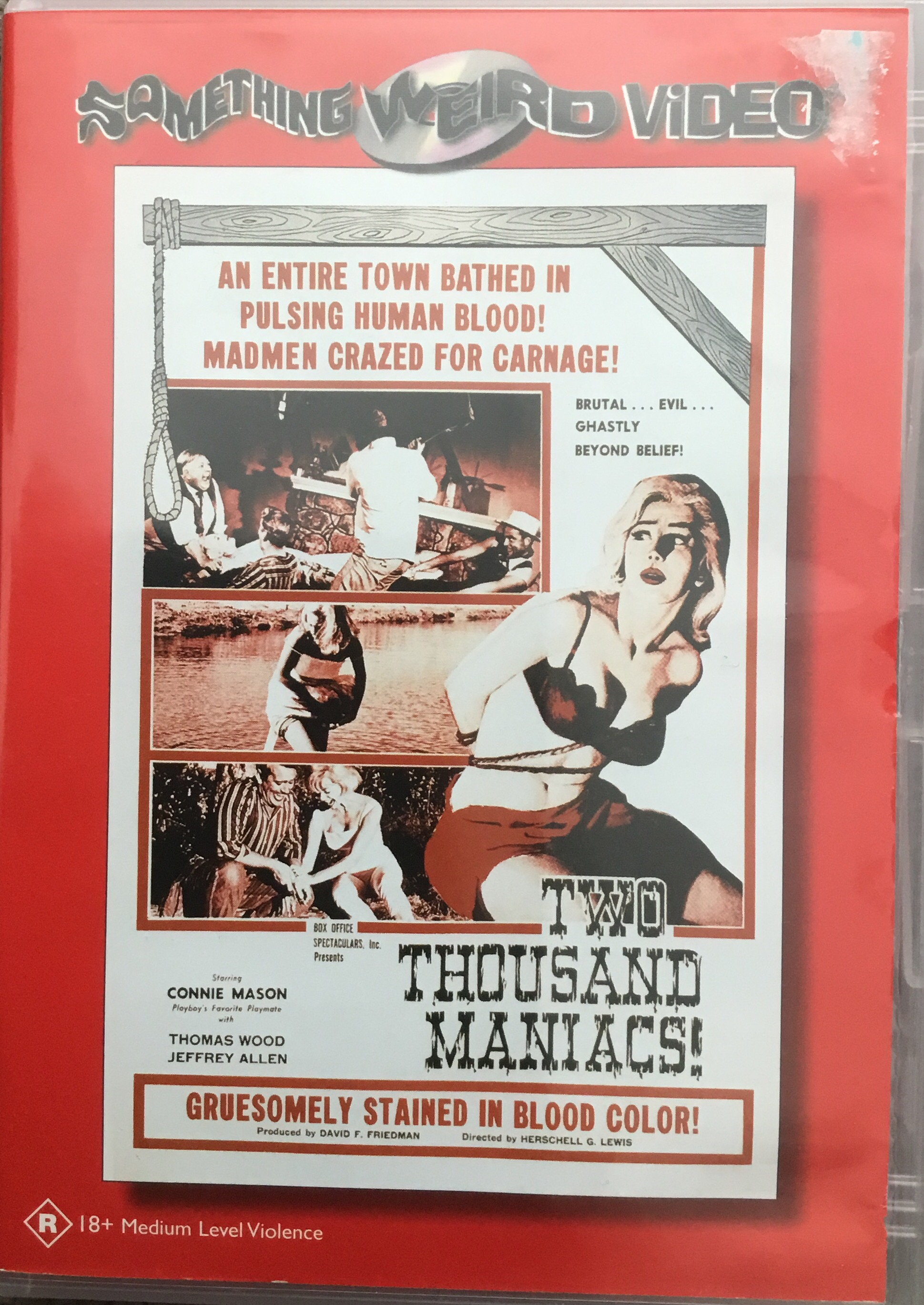 Nicknamed the godfather of gore, H.G. Lewis got his start in nudie cuties before throwing guts into our lap with his debut splatterfest Blood Feast. The popularity of that film brought us this, his, and producer David F. Friedman’s second horror film, Two Thousand Maniacs!