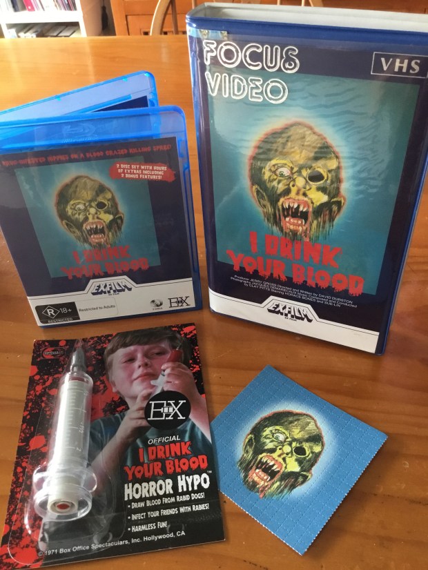Last is an Australian bluray release of cult classic I Drink Your Blood! This limited edition comes with a repro of the VHS release, a ‘horror hypo’ and a sheet of I Drink Your Blood LSD sheets. Best thing about this release is it also comes with the films I Eat Your Skin and Blue Sextet! I love this film just because the exquisitely beautiful Lynn Lowry appears an a mute hippie!