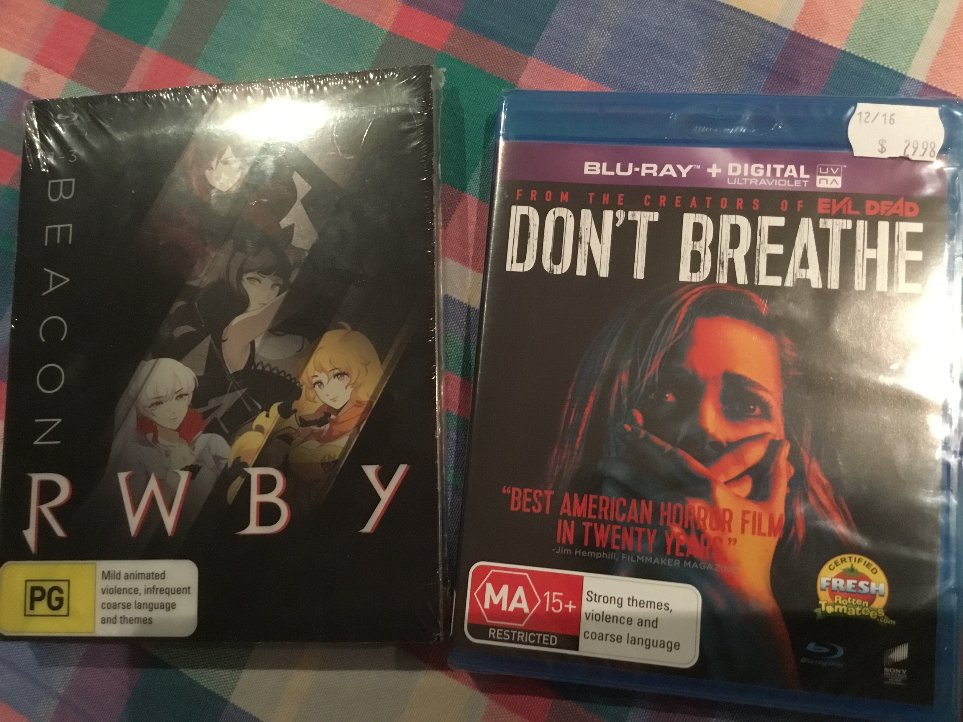 Which brings me to my bluray purchase, which includes collections 1, 2 and 3 of the anime RWBY, a horror from Monster Pictures called Satanic and the heart-stopping horror film Don’t Breathe. No doubt reviews if the movies are on their way!