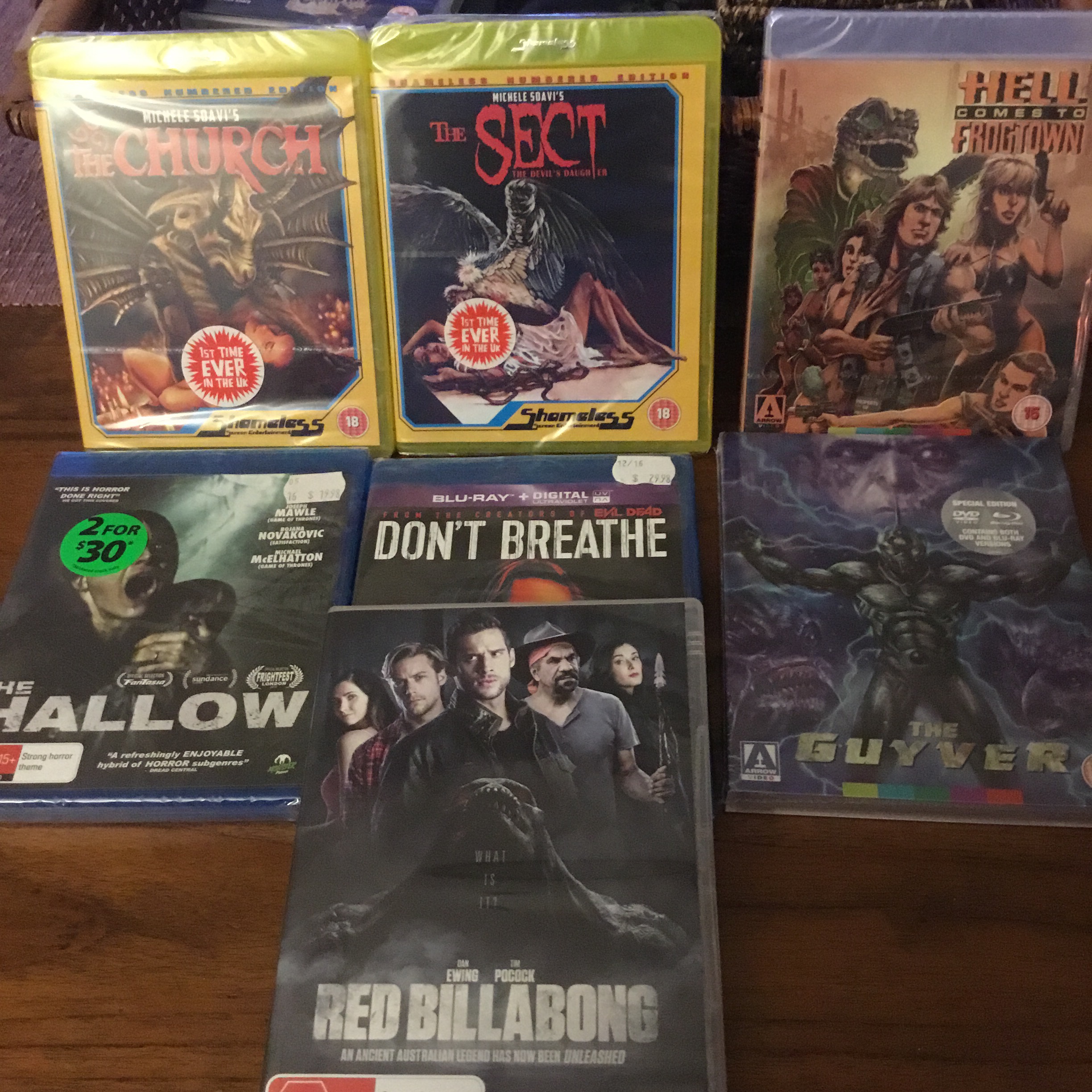 On bluray I grabbed the Australian release of The Hallow, based on a trailer I saw on the All Through The House Bluray. From Shameless Screen Entertainment I grabbed The Church and The Sect, and from Arrow Video I scored Hell Comes to Frogtown and The Guyver. Don’t Breathe was from last week, but cheekily made its way into this pic!
