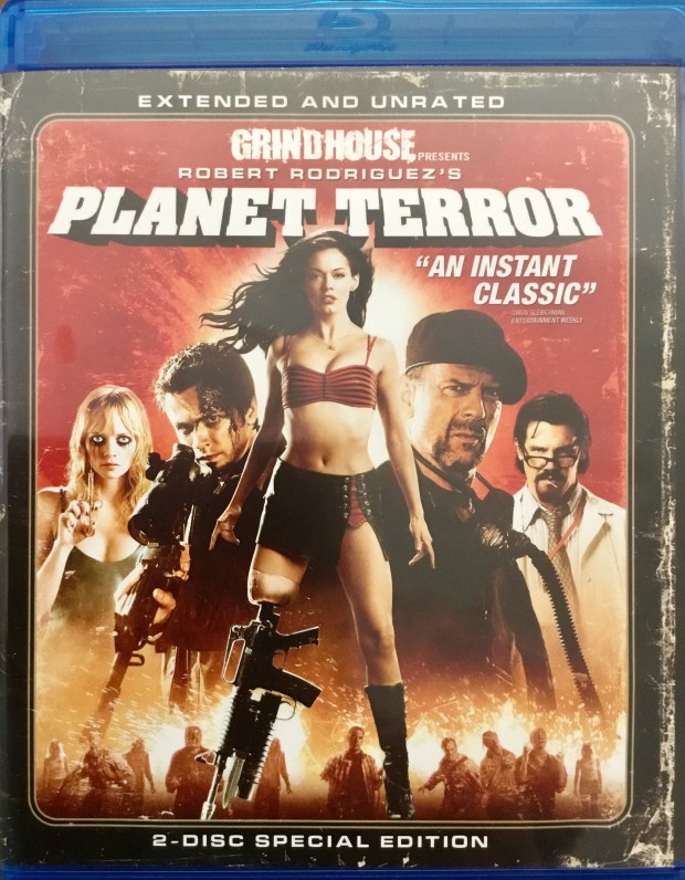 According to Rodriguez’s forward in the book ‘Grindhouse: The Sleaze-Filled Saga of an Exploitation Double Feature’, he came up with idea of a double feature before he filmed Sin City, but put it on hold until he presented the idea to Quentin Tarantino. Tarantino loved the idea and eventually the two decided to of make two brand new films that were made to look like 70s exploitation flicks. Those two film became RR’s Planet Terror and QT’s Death Proof as tragically the experiment failed, and the distributors, the Weinstein Brothers withdrew it from release, only to release each film as single feature, double disc blurays, this one being Planet Terror.