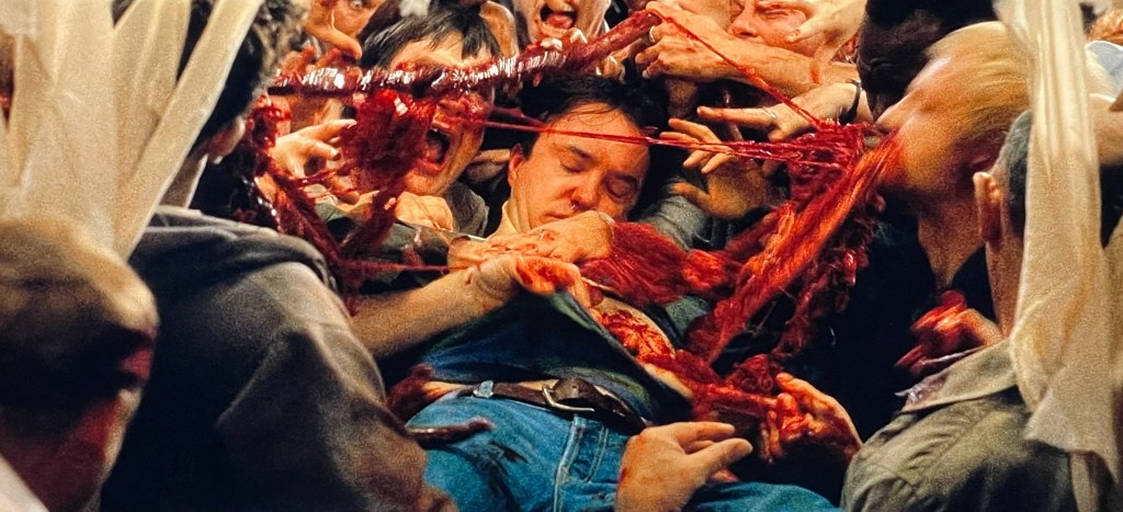 Shaun of the Dead runs the gamut of gruesome gore and clever comedy…so much so you may find your head spinning. There are so many references to other zombie films that you probably won’t pick up on all of them the first time you watch it, like the Italian restaurant named Fulci’s, the electronics store called Foree’s, and the assistant manager named Ash. Seeing as how the creators and many of the other cast are from the Pegg/ Wright creation, Spaced, there are many subtle tips of the hat to that show as well, not to mention a selection of English comedy and music favourites (look out for Little Britain’s Matt Lucas, The Hobbit’s Martin Freeman, League of Gentlemen’s Mark Gatiss and Reece Shearsmith and Coldplay’s Chris Martin and Jonny Buckland to name a few). As for the zombies themselves, well, there are some really freakish ideas, like a wheelchair bound zombie…and I shall never look at twins the same way again. Also interesting is the way that Pegg and Wright have compared our mortal existences to those of the hordes of zombies. Are we really any different?