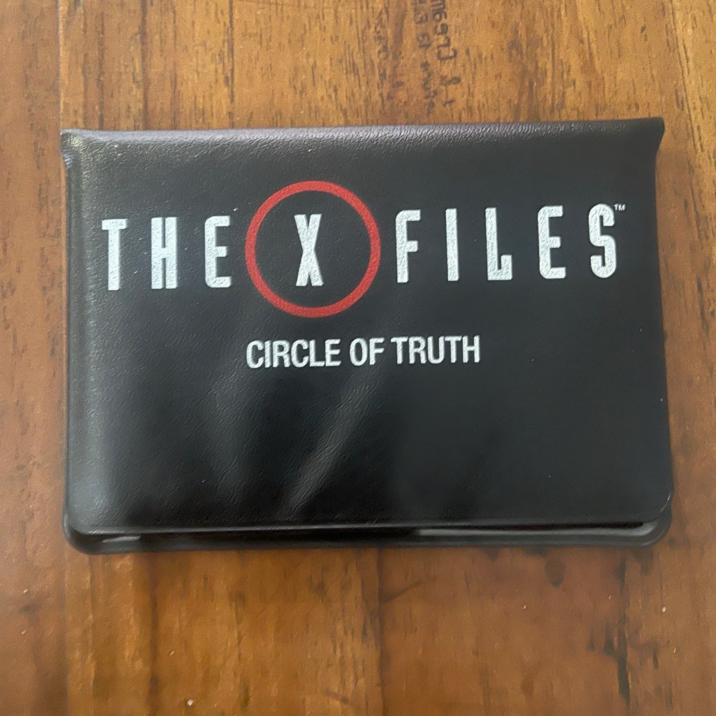 The other 18 cards have ‘cases’ on one side and 4 images of aliens, microscopes, guns and other things the FBI would use, on a variety of backgrounds representing ‘places’, like fields, sewers etc, and the game set up sees three cases picked for the middle of the table, and the other 15 cards placed with the 4 images facing up in a circle around them (‘Circle’ of Truth… see?).