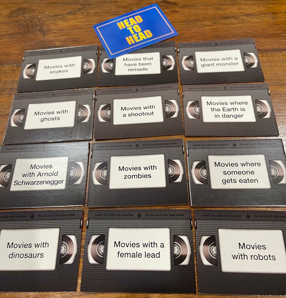 The game is played in 2 teams, in 2 rounds. In the first round, a card is drawn from a deck titled ‘Head to Head’ and from each team, a representative is chosen to play in this round. On the face of each Head to Head card is a description of a movie, like ‘Movies with a Dragon’ or ‘Movies with a Dog’ or ‘Movies with a Giant Monster’ etc, and over the course of 15 seconds, timed with a supplied timer, each representative has to give an example of a movie that fits the description. For example, in that last example, King Kong, Godzilla, Gamera and their Kaiju comrades. The two go back and forth with titles, and the person who hasn’t answered when timer goes off is the loser.