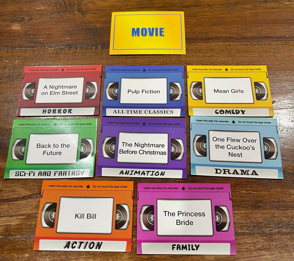 The Blockbuster Party Game is a party game for 4 to 10 people, who in my family’s experience, plays best with 8, and it’s not a trivia game, but it is about movies.