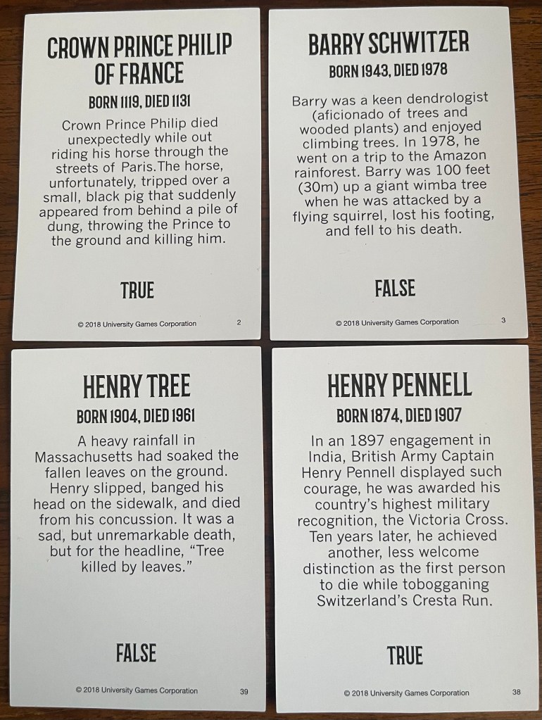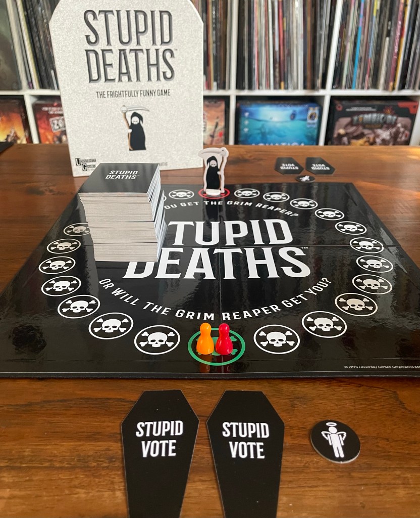Stupid Deaths is a 2 to 6 player game that FEELS like a trivia game, but isn’t.