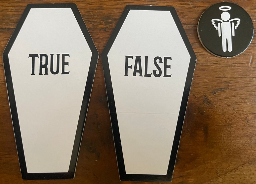 In addition to your player piece, you are also offered an extra life token, and two coffin shaped cards, one with ‘TRUE’ written on it, and the other with ‘FALSE’.