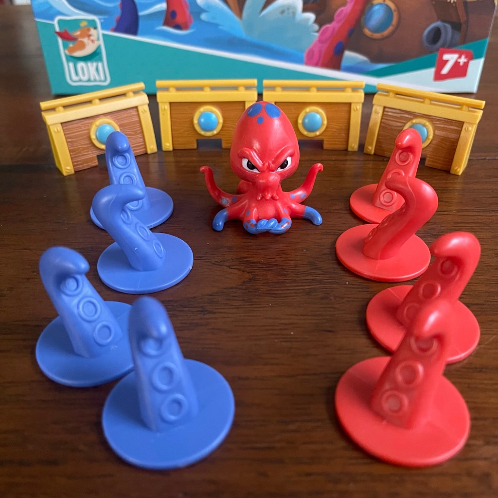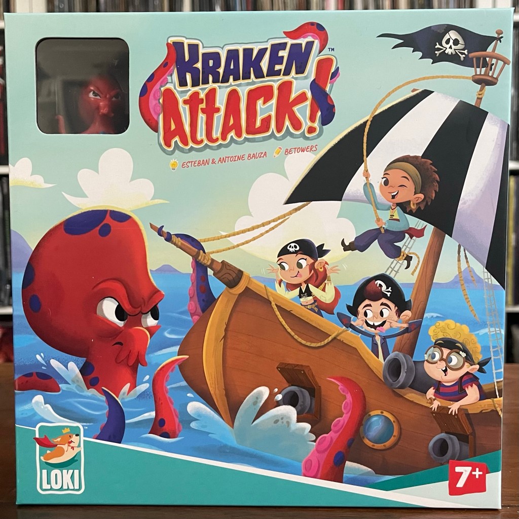 Kraken Attack is a co-operative game, which means the players work with each other against the game, and everyone plays a different pirate on a pirate ship getting attacked by a kraken. The pirates win if they injure the kraken three times, and the players are beaten if the kraken hits the ship four times.