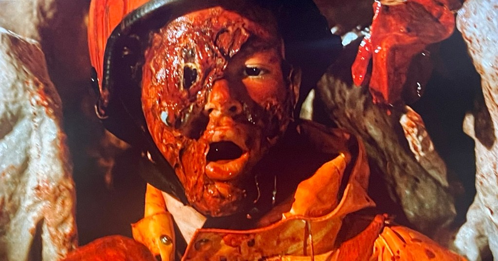 Once down there, the rock starts to pulsate and a bizarre ‘thing’ comes out, attacking the crew, murdering them one by one in all manner of gory ways. Panicked, they lose their way in the caves but will any of them escape? And if that blue rock had that ‘thing’ in it, what of all the others above ground..?