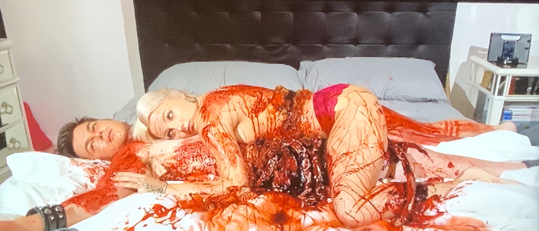 I’m gonna start with the gore as it really is in your face and all looks practical. Leone a-pears to have come from a make up and special effects background and it’s generally good when those people end up directing as they can see how an effect can be done practically and not resort to substandard CGI. The only effects work I don’t really like was the make up on the nonsensical prologue that ties in with the ending.